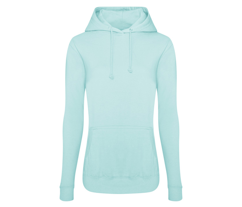 Sweat à capuche femme. Coupe féminine. Double coutures. Capuche doublée. Cordons ton sur ton. Poche kangourou. Taille et poignets en bords côte. Intérieur brossé. Étiquette détachable.