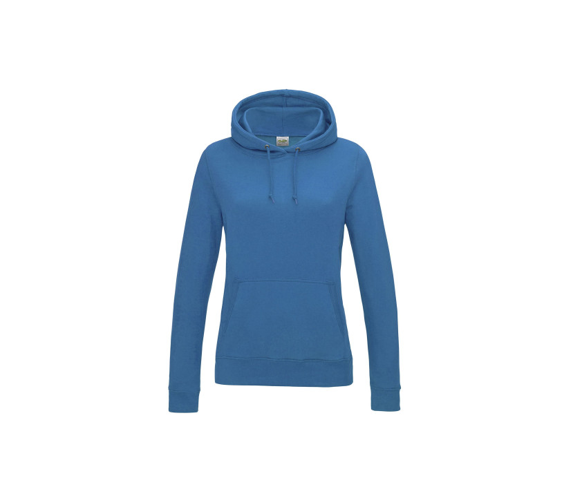Sweat à capuche femme. Coupe féminine. Double coutures. Capuche doublée. Cordons ton sur ton. Poche kangourou. Taille et poignets en bords côte. Intérieur brossé. Étiquette détachable.