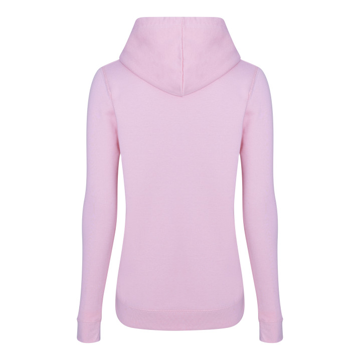 Sweat à capuche femme. Coupe féminine. Double coutures. Capuche doublée. Cordons ton sur ton. Poche kangourou. Taille et poignets en bords côte. Intérieur brossé. Étiquette détachable.