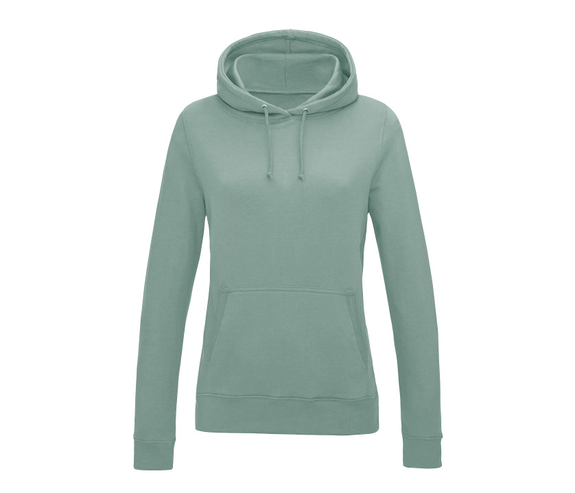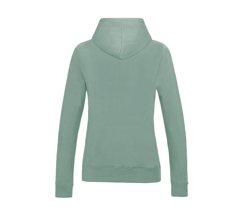 Sweat à capuche femme. Coupe féminine. Double coutures. Capuche doublée. Cordons ton sur ton. Poche kangourou. Taille et poignets en bords côte. Intérieur brossé. Étiquette détachable.