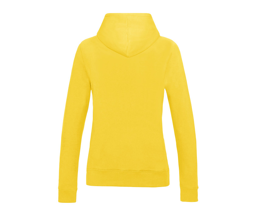 Sweat à capuche femme. Coupe féminine. Double coutures. Capuche doublée. Cordons ton sur ton. Poche kangourou. Taille et poignets en bords côte. Intérieur brossé. Étiquette détachable.