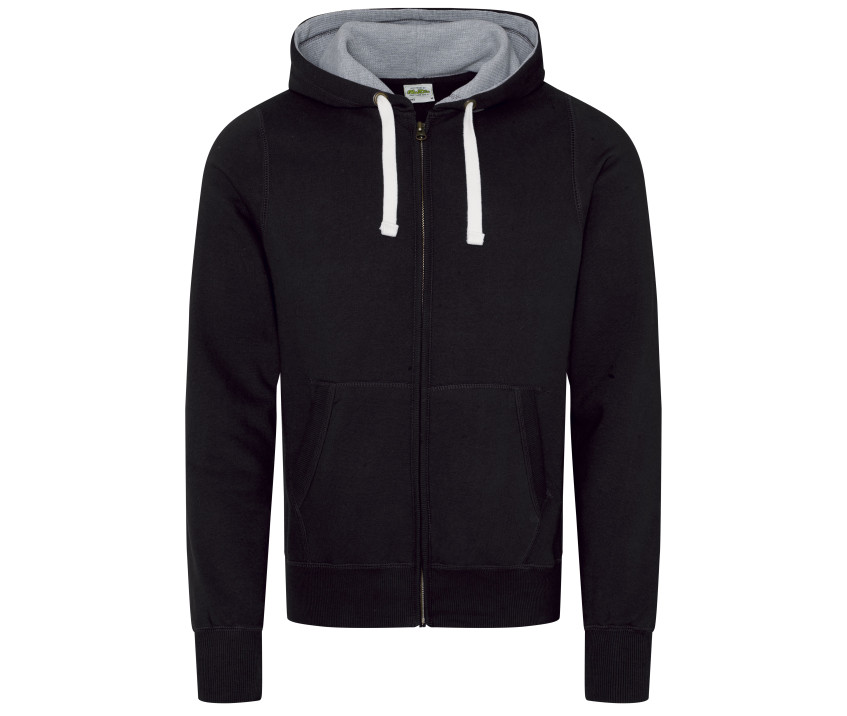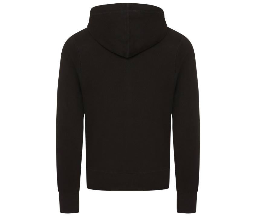 Fermeture grand zip recouverte par un bord côte. Empiècements sur les côtés. Coutures en sûrjet. Capuche doublée par un tissu gaufré heather grey. Poches kangourou. Épais cordons blancs. Poignets et taille en bords côte épais. Intérieur brossé. Étiquette détachable.