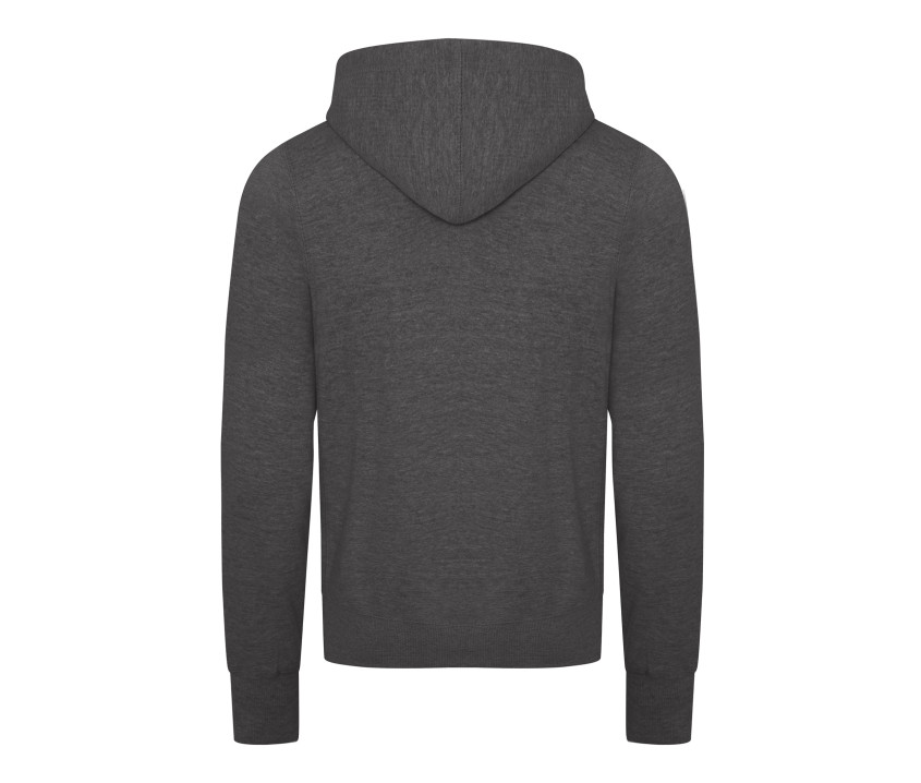 Fermeture grand zip recouverte par un bord côte. Empiècements sur les côtés. Coutures en sûrjet. Capuche doublée par un tissu gaufré heather grey. Poches kangourou. Épais cordons blancs. Poignets et taille en bords côte épais. Intérieur brossé. Étiquette détachable.