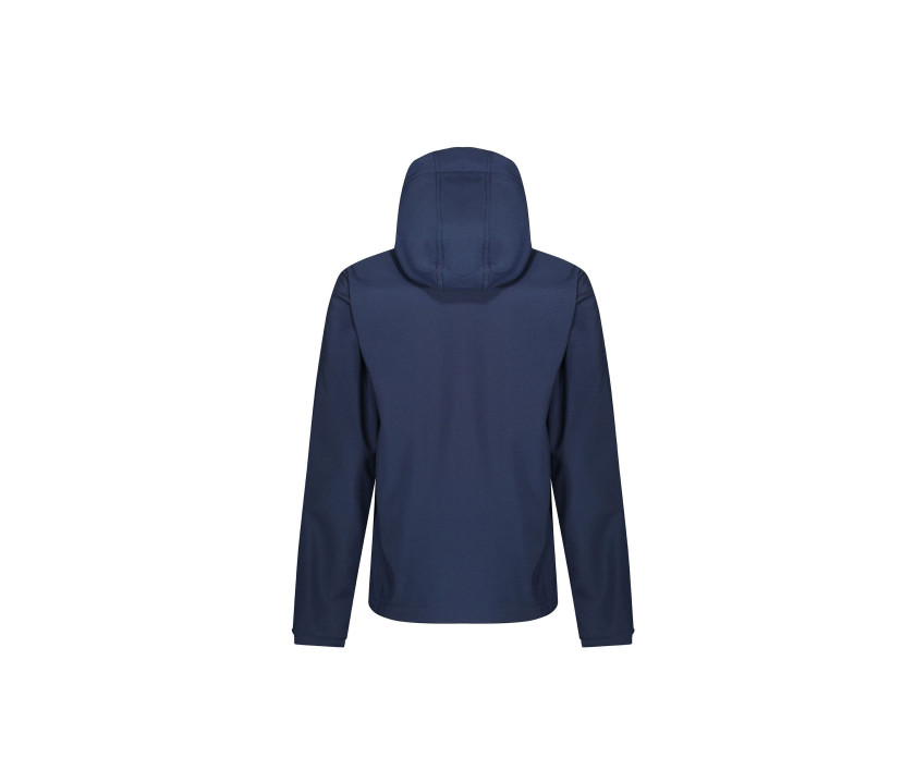 Veste Softshell 3 couches (imperméable, coupe-vent, respirant). Déperlant. Capuche montée avec cordon ajustable (s'attache par zip sur l'arrière et Velcro® sur les côtés). 2 poches avant zippées. Poche poitrine. Poignets ajustables. Convient à la sérigraphie, au transfert et à l'impression vinyle. Imperméable 5000mm et respirant 10000gr.