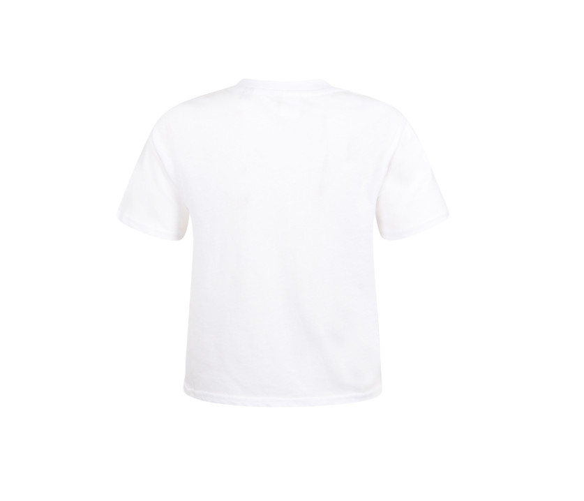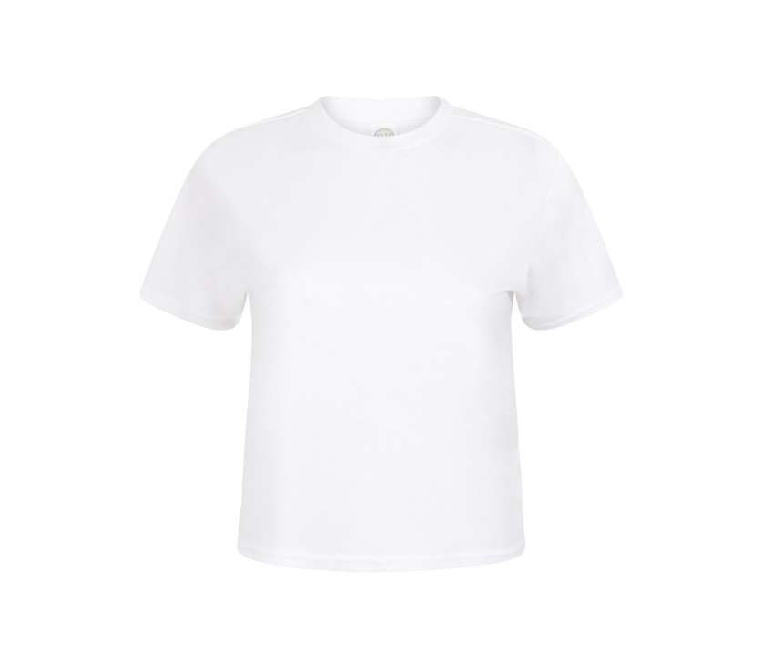Étiquette détachable. Tee-shirt surdimensionné. Coupe courte. Double couture à la taille. Col en bords côte stretch.