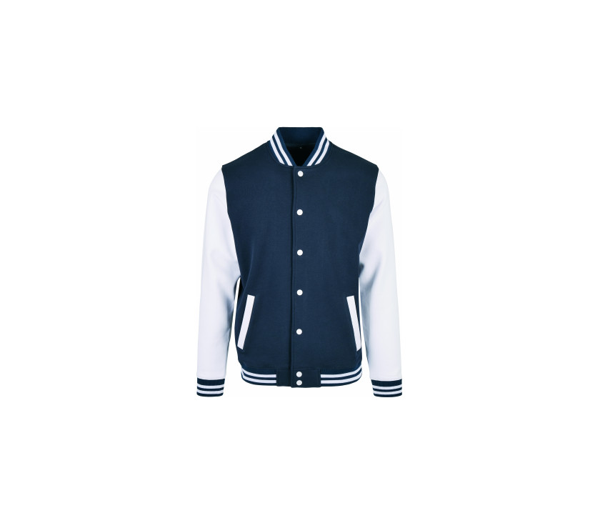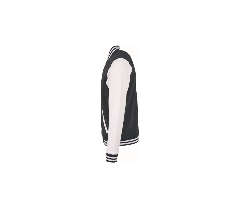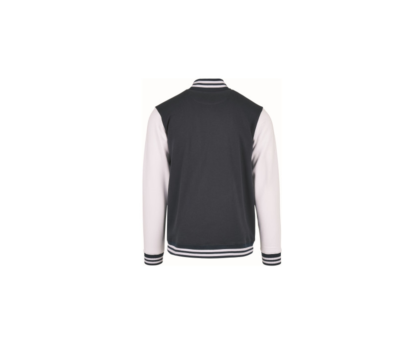 Fermeture par boutons pression blancs. Manches droites et contrastées. Col, taille et poignets en bords côte avec bandes contrastées.
