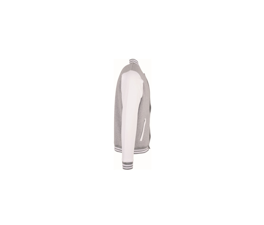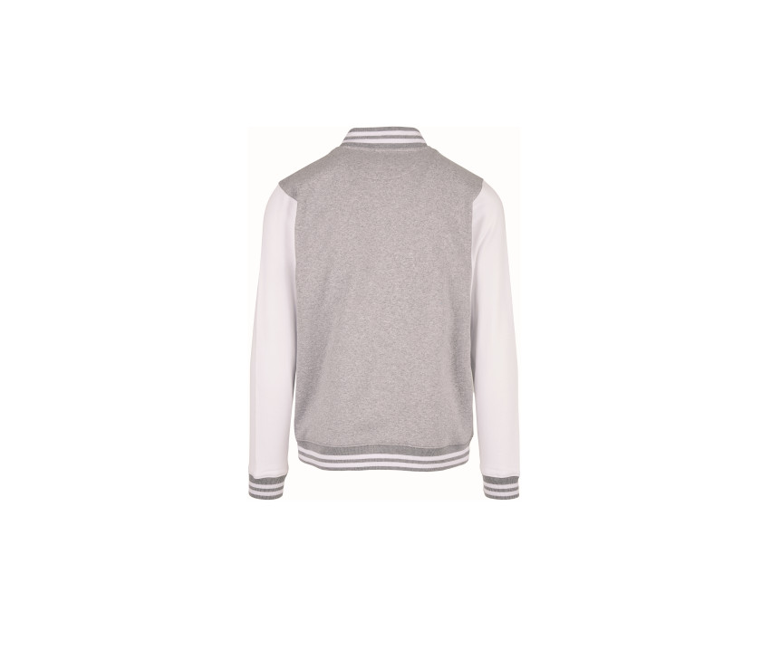 Fermeture par boutons pression blancs. Manches droites et contrastées. Col, taille et poignets en bords côte avec bandes contrastées.