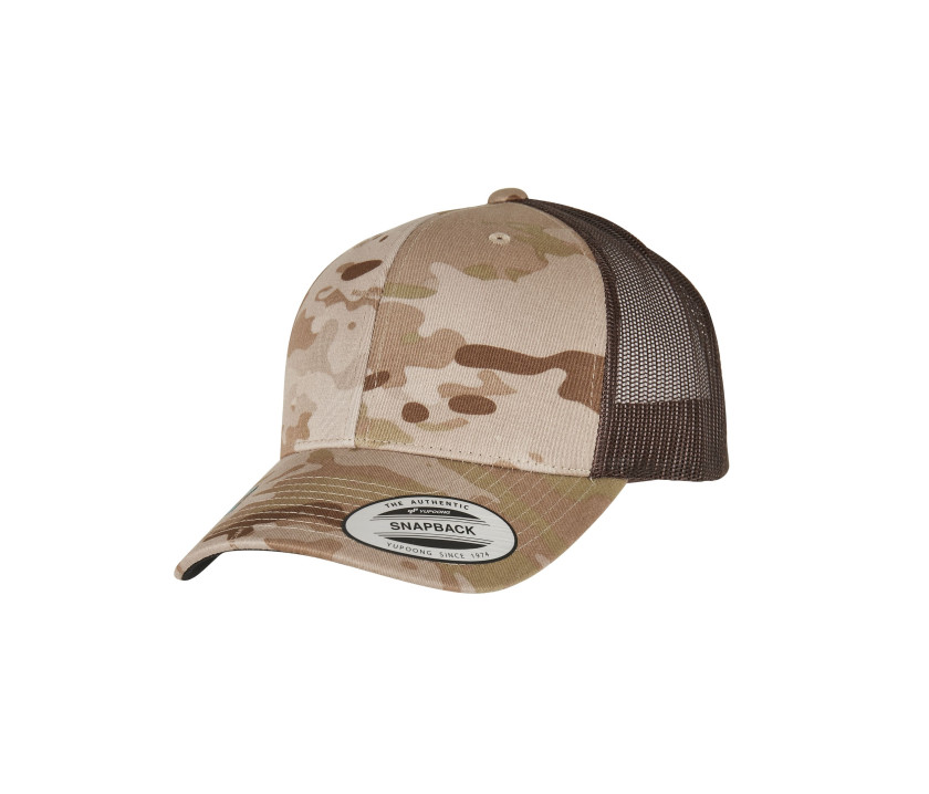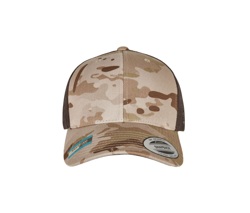 Casquette style trucker camouflage - 6 panneaux. Panneaux arrière et sur les côtés en filet. Fermeture par patte en PVC.