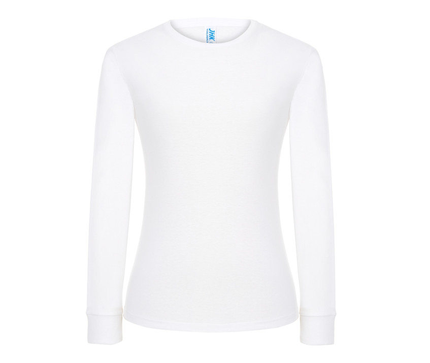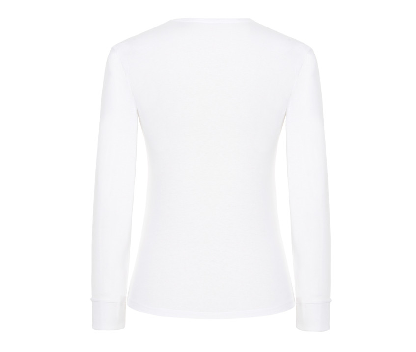 Tee-shirt femme manches longues à bord côte. Coupe tubulaire. Double surpiqûre au cou, épaules et taille. Col avec bord côte élasthanne. Bande de propreté au cou et épaules. Etiquette amovible.