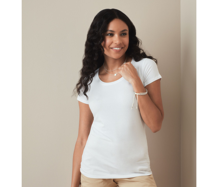 Tee-shirt près du corps. Bande de propreté contrastée. Encolure ample. Coutures aux épaules renforcées. Col fin dans la même matière. Coutures latérales. Petite étiquette de taille dans le cou. Étiquette d’entretien dans la couture latérale.