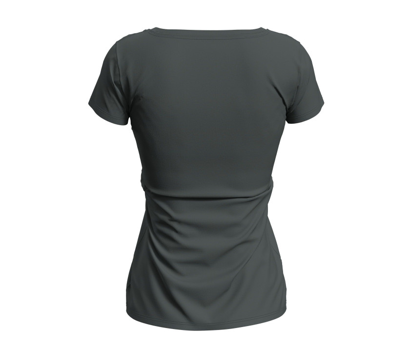 Tee-shirt près du corps. Bande de propreté contrastée. Encolure ample. Coutures aux épaules renforcées. Col fin dans la même matière. Coutures latérales. Petite étiquette de taille dans le cou. Étiquette d’entretien dans la couture latérale.
