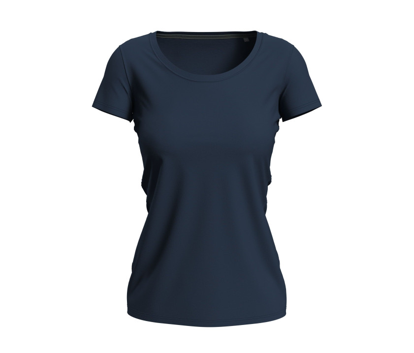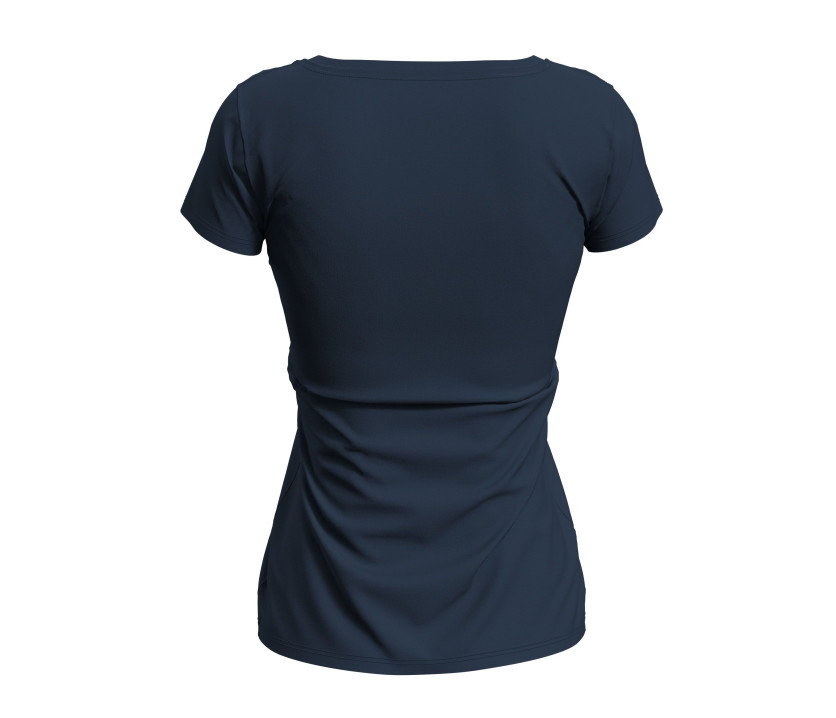 Tee-shirt près du corps. Bande de propreté contrastée. Encolure ample. Coutures aux épaules renforcées. Col fin dans la même matière. Coutures latérales. Petite étiquette de taille dans le cou. Étiquette d’entretien dans la couture latérale.