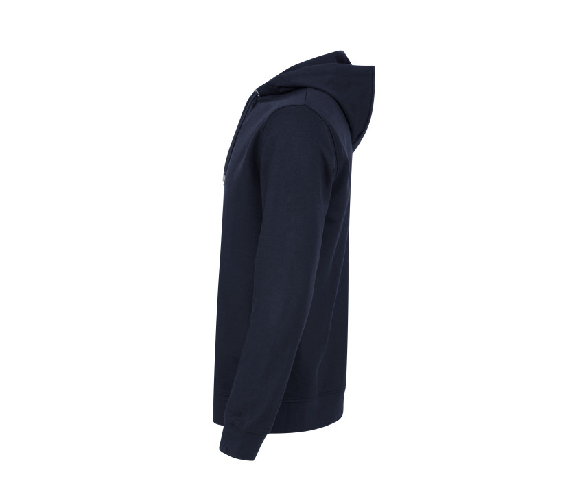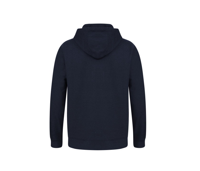 Intérieur gratté. Poignets et taille en bords côte. Manches droites. Capuche avec cordon ajustable. Œillets et bouts du cordon en métal recyclé. Empiècement V côtelé au col.