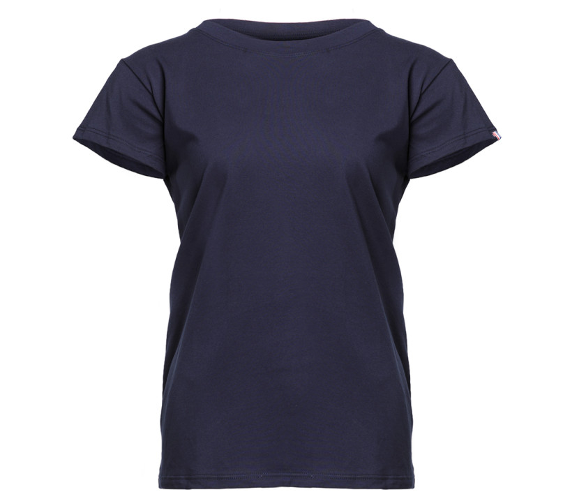 Coupe cintrée. Col rond. Pas d'étiquette de marque, seulement une puce de taille au col. Composition cousue dans la couture intérieure latérale gauche. Coton peigné de belle qualité. Bande de propreté au col. Double surpiqure bas et manches. Drapeau tricolore sur la manche. Origine France garantie.