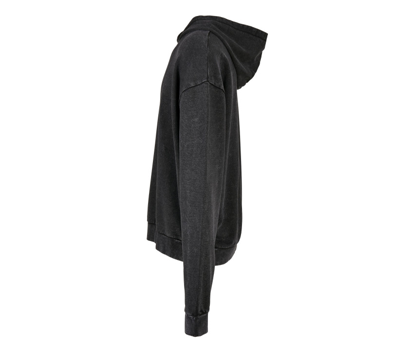 Décoloré à l'acide. Épaules tombantes. Capuche sans cordon de serrage. Couture divisant la capuche du sweat. Coupe ample. Poignets et taille en bord côte. French Terry.
