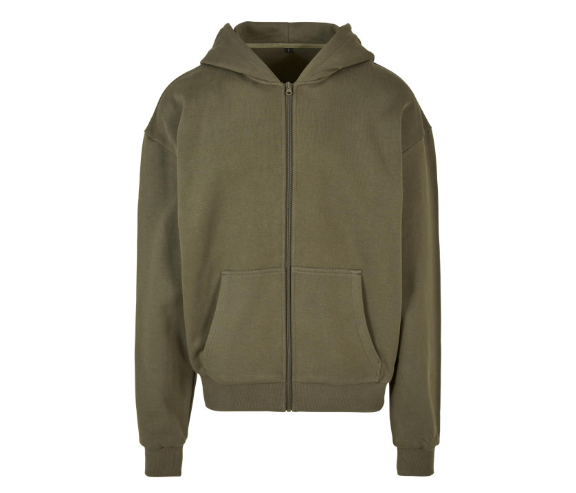 Fermeture grand zip métallique. Bords côte épais aux poignets et à la taille. Capuche classique mais sans cordon. Poches kangourou. Coupe large. Intérieur French Terry.