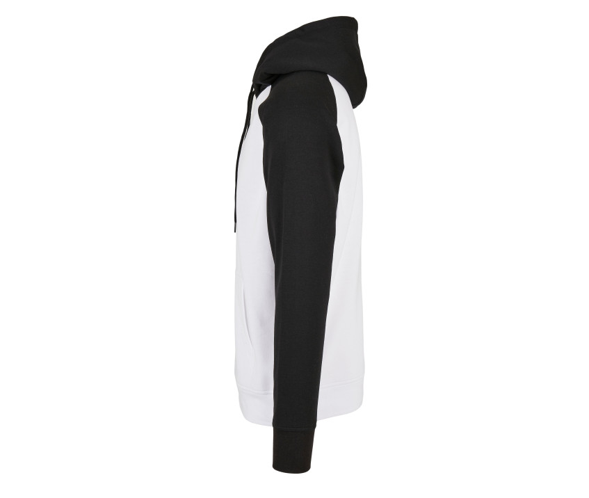 Manches raglan. Intérieur gratté. Capuche et manches contrastées. Capuche ajustable. Poche kangourou. Puce de taille au col.