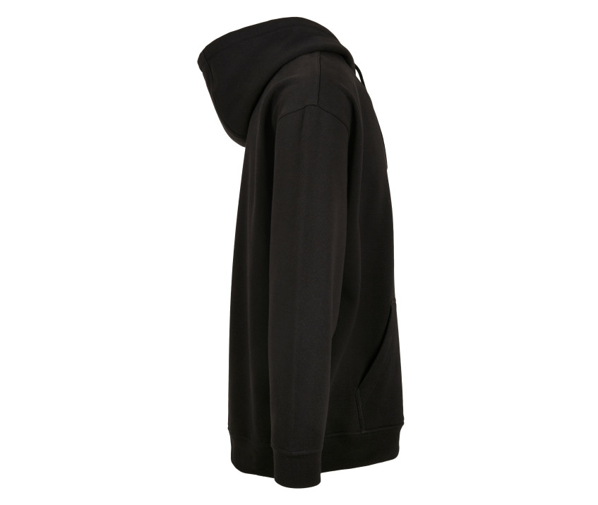 Coupe très ample. Manches droites. Capuche ajustable par cordons. Poche kangourou. Bord côte épais aux poignets et à la taille. Puce de taille au col.