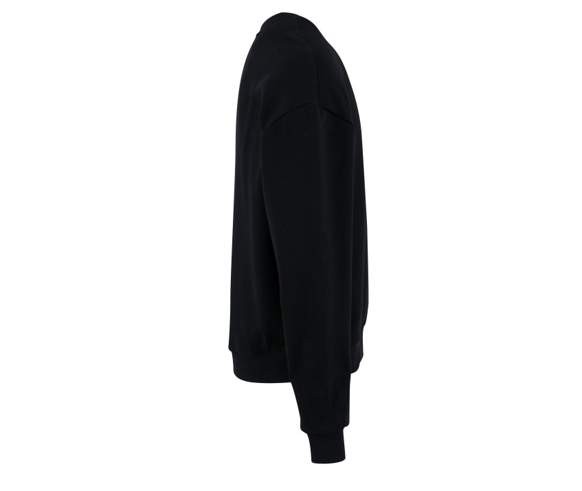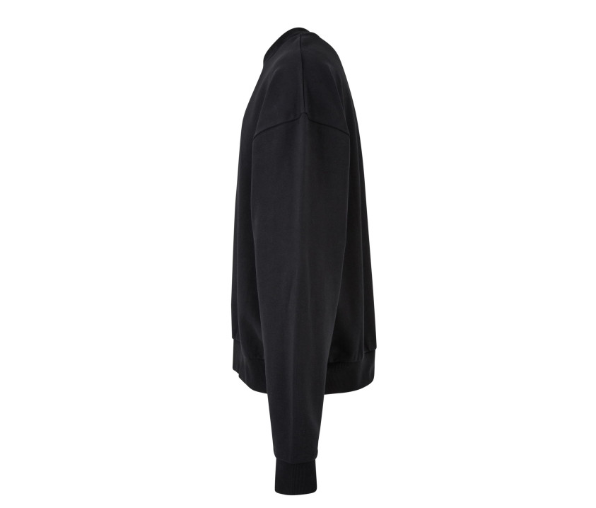 Intérieur French Terry. Poignets, col et taille en bord côte. Épaules tombantes. Sans étiquette de marque, uniquement une puce de taille.