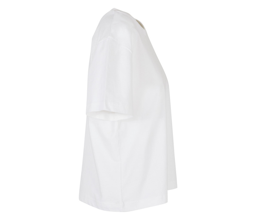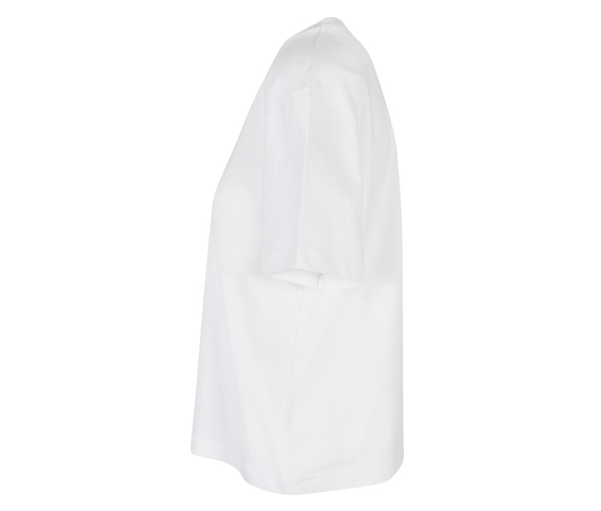 Coupe oversize décontractée. Épaules tombantes. Col ras-du-cou en bord côte. Sans étiquette de marque, uniquement une puce de taille.