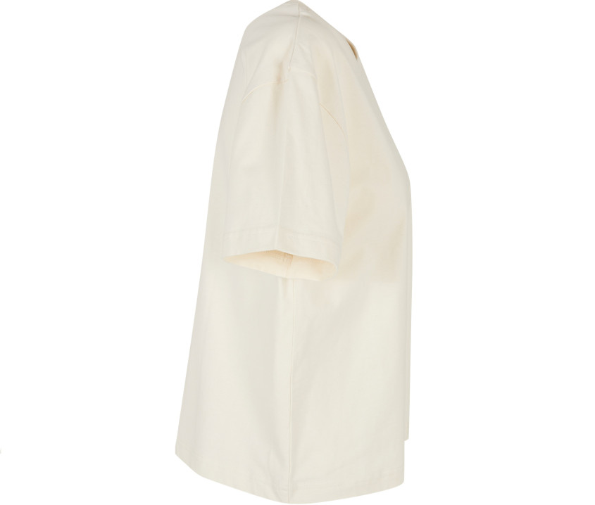 Coupe oversize décontractée. Épaules tombantes. Col ras-du-cou en bord côte. Sans étiquette de marque, uniquement une puce de taille.