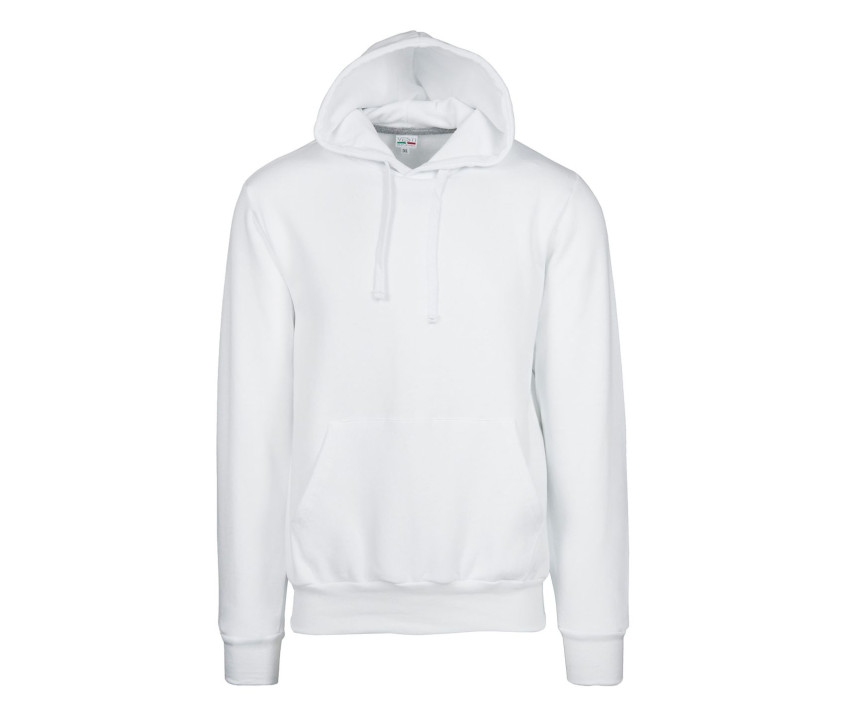 Poche kangourou. Taille et poignets en bord côte. Coupe tubulaire. Capuche doublée. Bande de propreté contrastée.