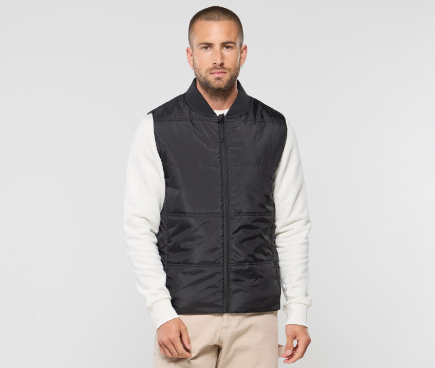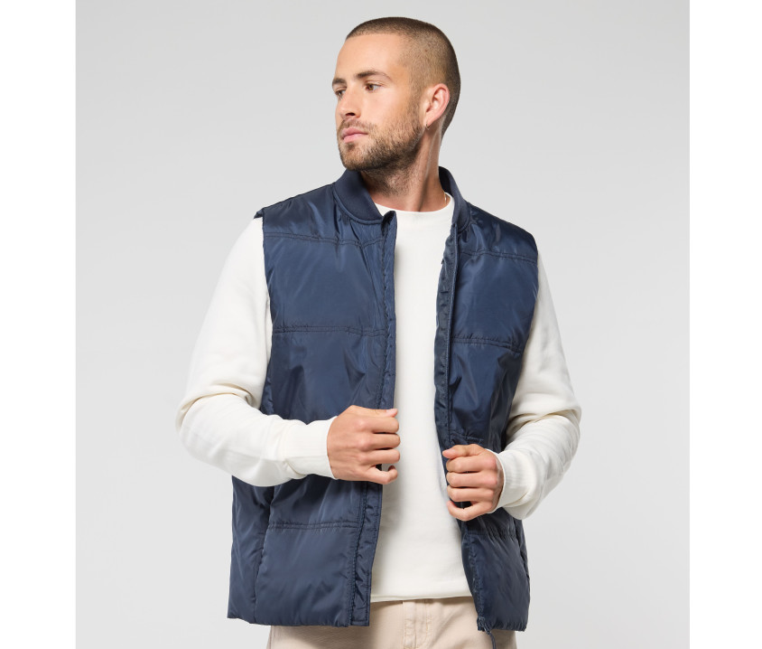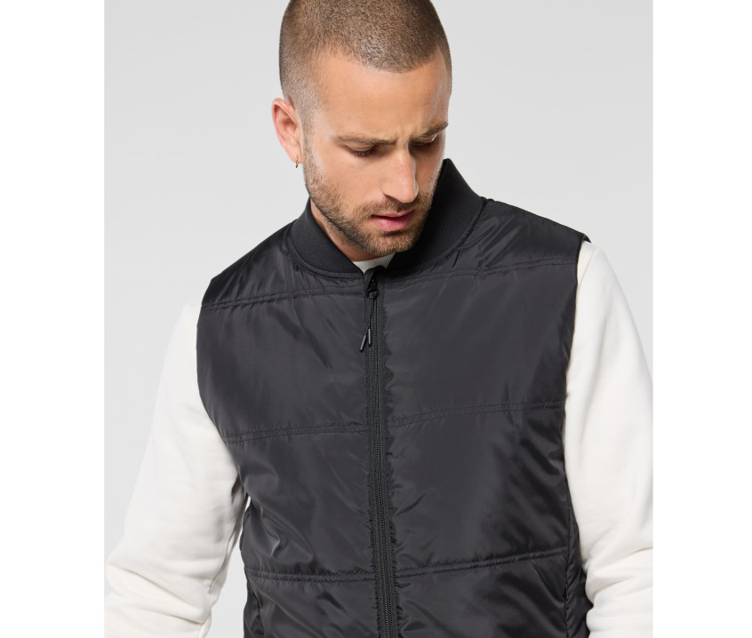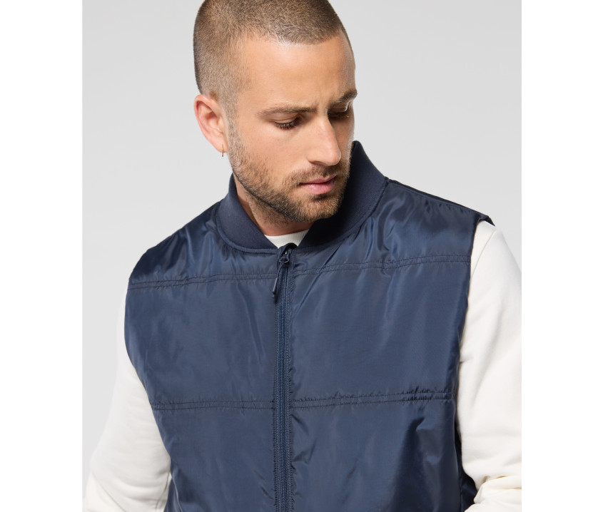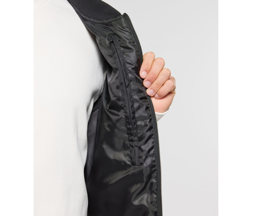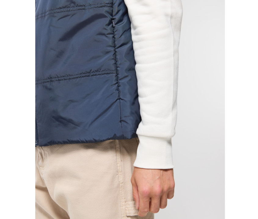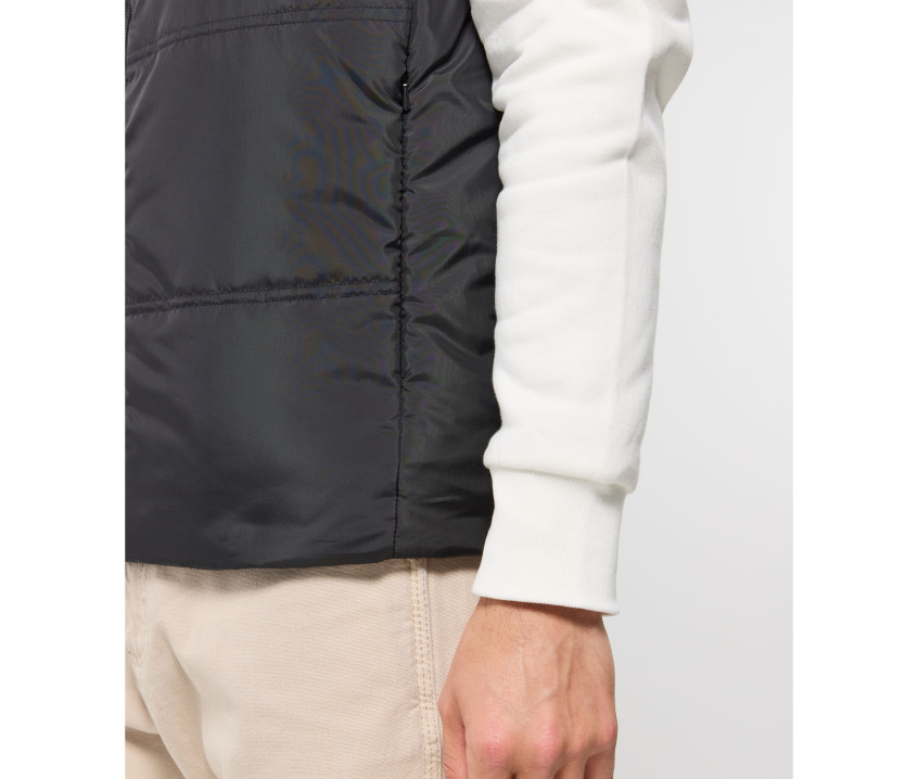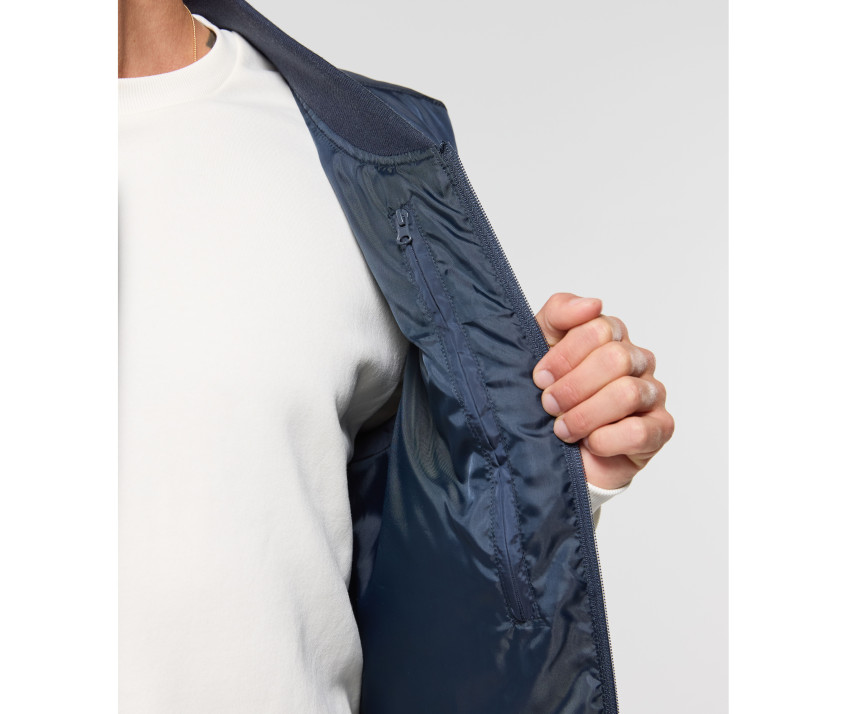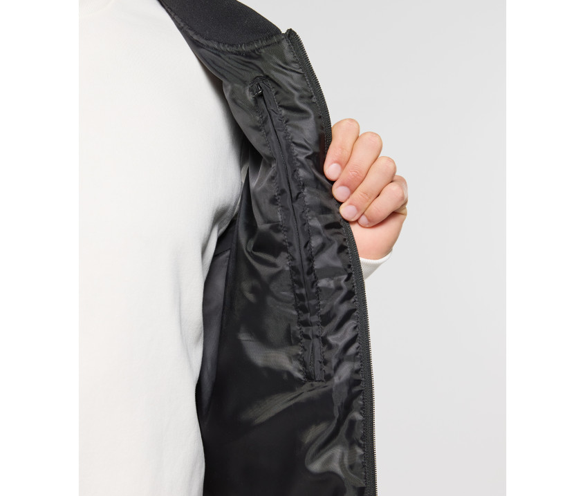 Col en bord côte. 2 poches avec zip caché. 1 poche intérieure zippée. Accès marquage. Ouatine 100% polyester recyclé. Espacement entre les coutures : 14cm.