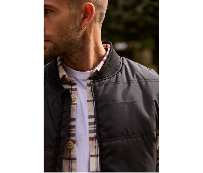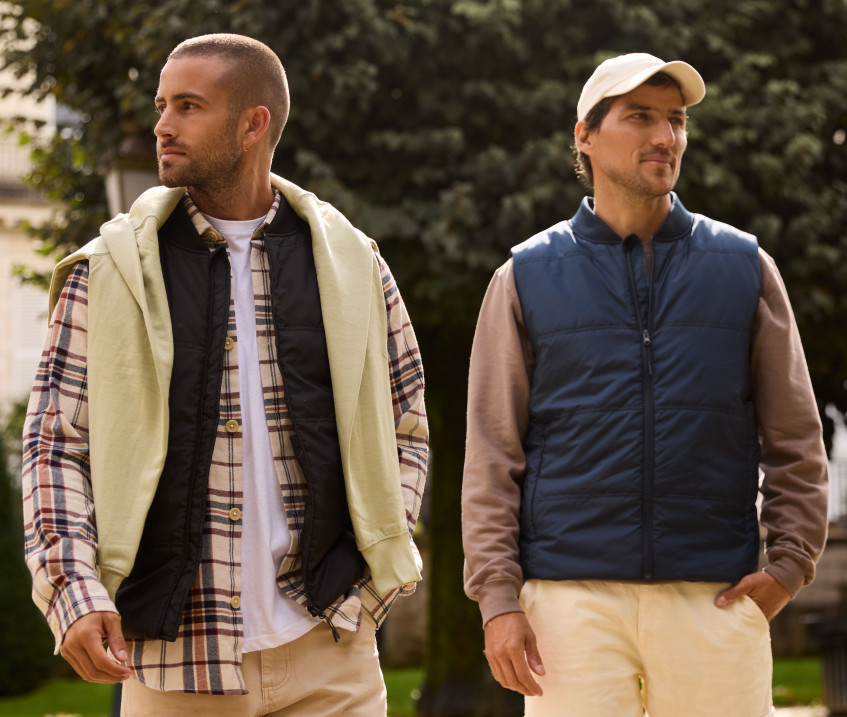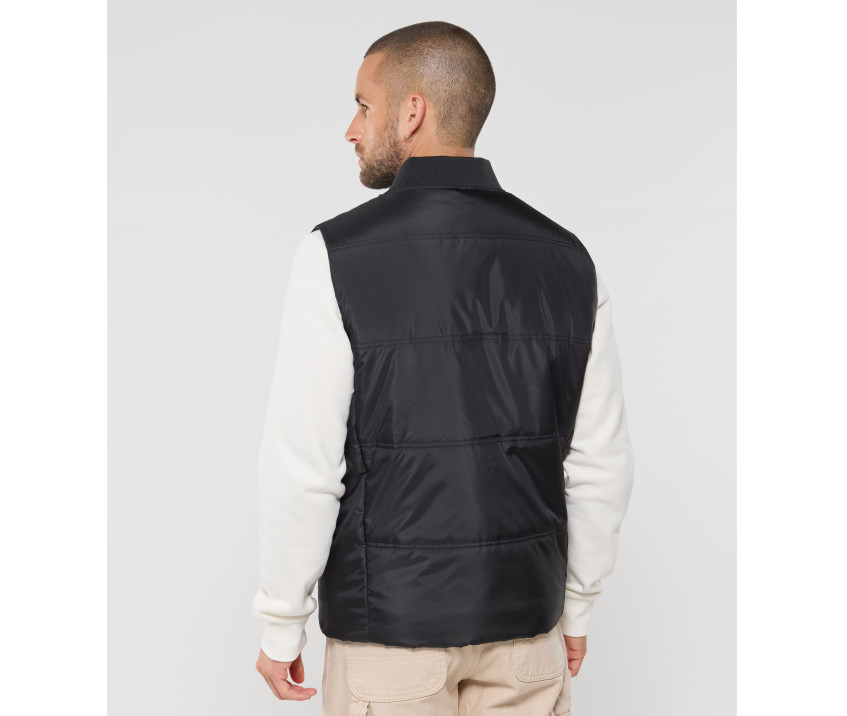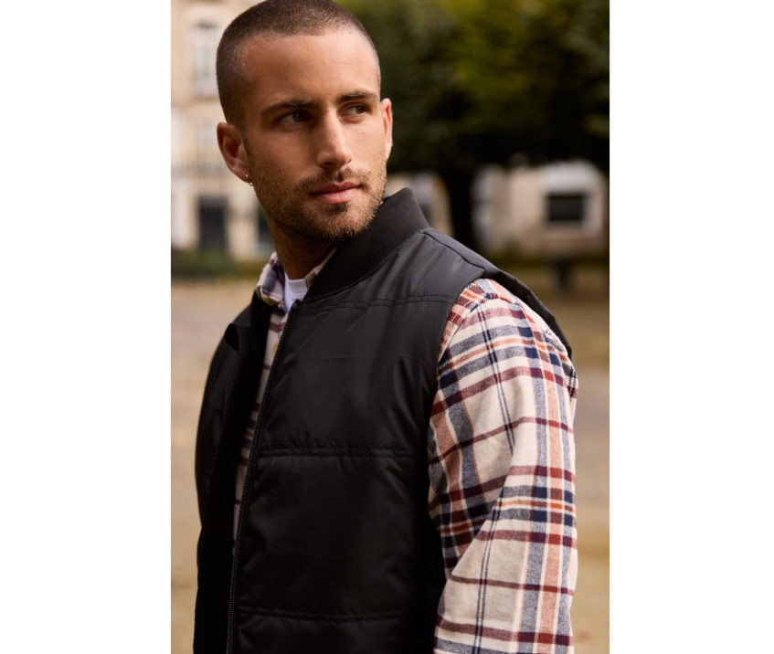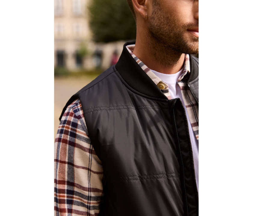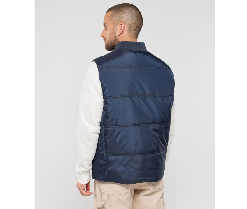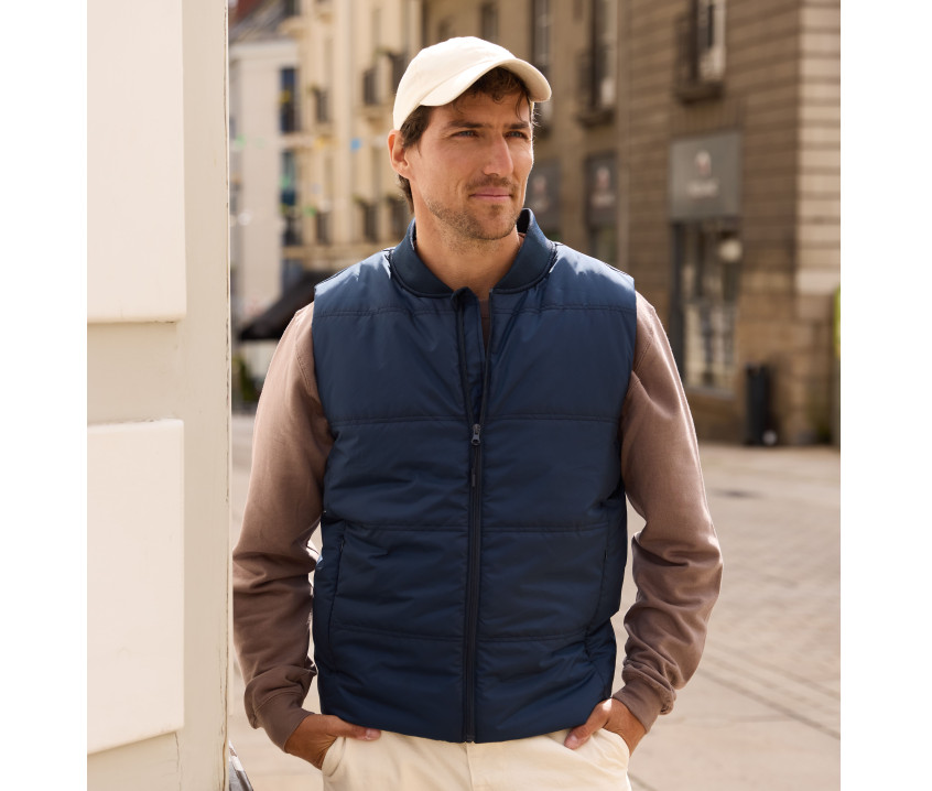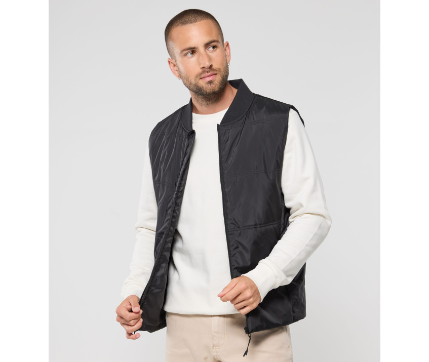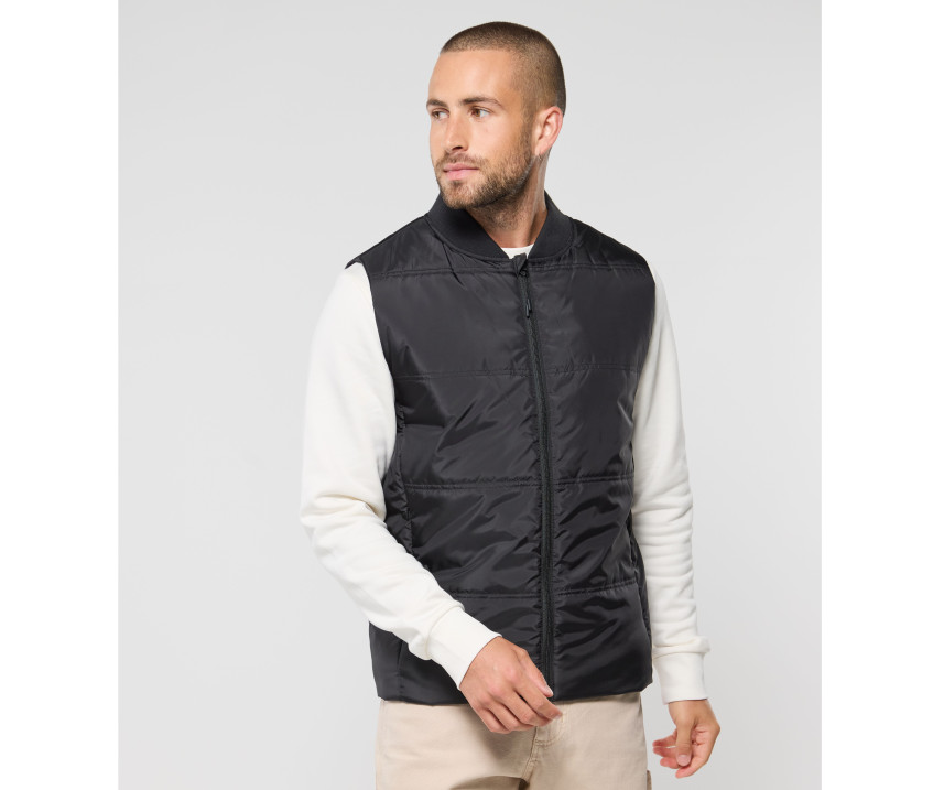 Col en bord côte. 2 poches avec zip caché. 1 poche intérieure zippée. Accès marquage. Ouatine 100% polyester recyclé. Espacement entre les coutures : 14cm.