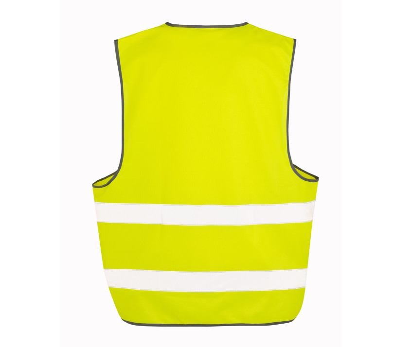 Bords gris en polyester. Bandes de sécurité cousues. Approuvé certification EN ISO20471. Fermeture : 2 velcros de 4cm. Nombre maximum de cycles de lavage recommandé : 25.