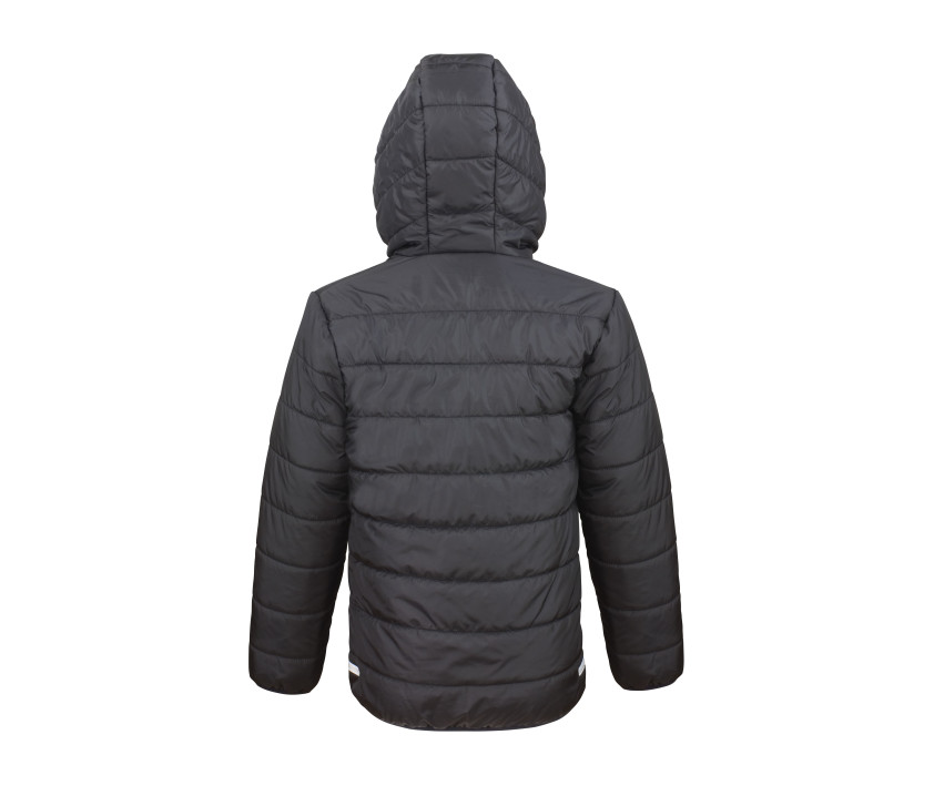 Fermeture grand zip. Finitions réfléchissantes aux poignets. Biais de finition poignets et bas de vêtement. Doublure et finitions constrastées. Poches zippées. Capuche attenante (dans le prolongement du col). Étiquette neutre dans le cou. Très douce, légère et chaude. Facile à ranger et compacte.