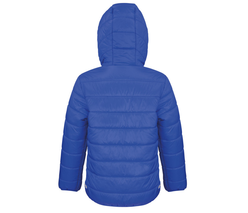 Fermeture grand zip. Finitions réfléchissantes aux poignets. Biais de finition poignets et bas de vêtement. Doublure et finitions constrastées. Poches zippées. Capuche attenante (dans le prolongement du col). Étiquette neutre dans le cou. Très douce, légère et chaude. Facile à ranger et compacte.