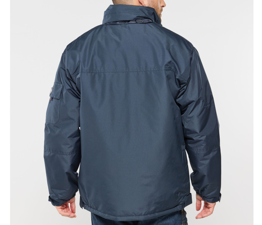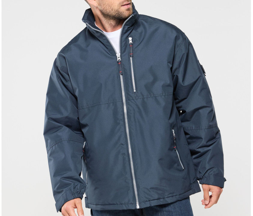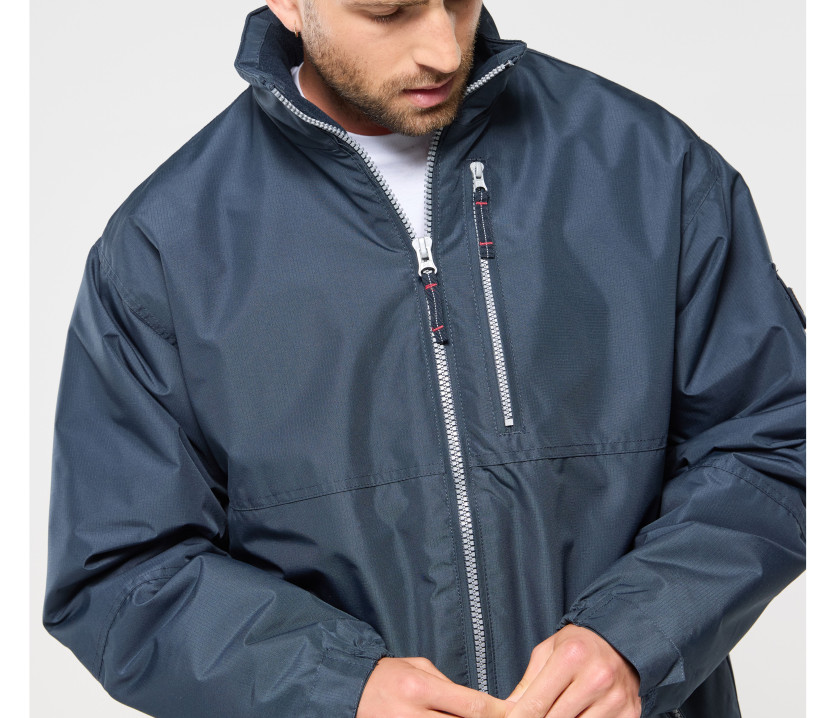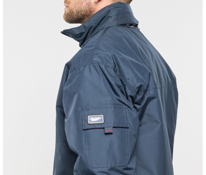 Coupe-vent respirant et imperméable. 1 poche poitrine zippée et 1 poche manche. 2 poches latérales zippées. Velcro® aux manches et bas du blouson. Col doublé polaire. Capuche dans le col. Accès pour personnalisation. Imperméabilité : 2000mm.