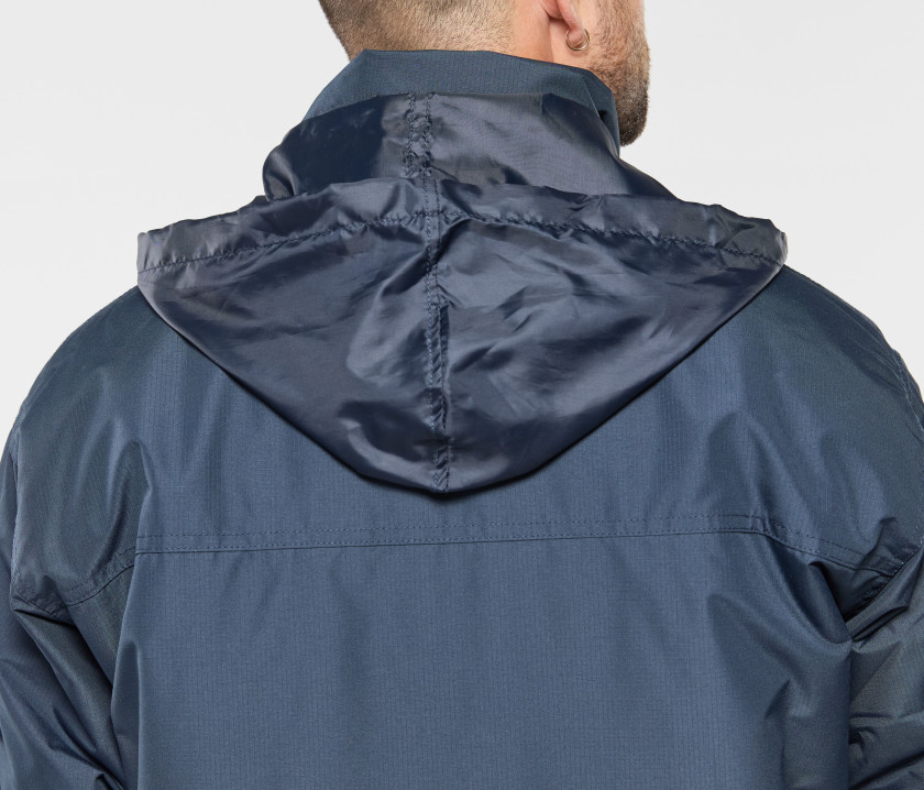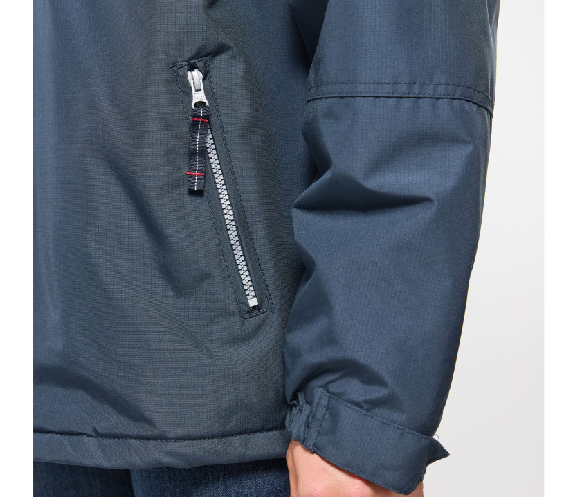 - Coupe-vent respirant et imperméable. Capuche dans le col. 1 poche poitrine et 2 poches latérales zippées.