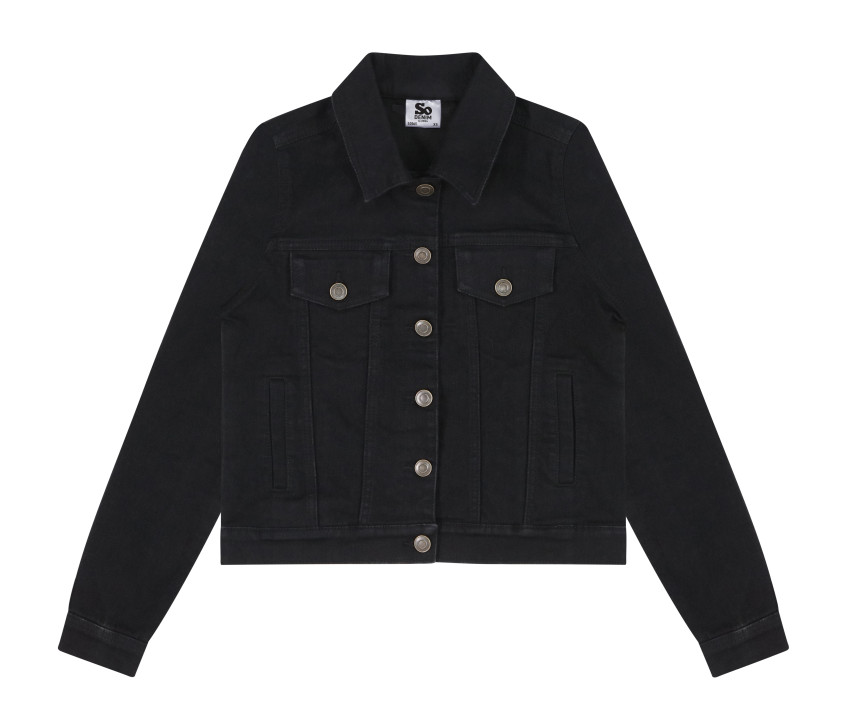 Coupe contemporaine féminine. Jean stretch. 4 poches. Coutures contrastées. Fermeture par boutons. Bouton de décoration aux poignets. Bride de suspension à l'intérieur du col.
