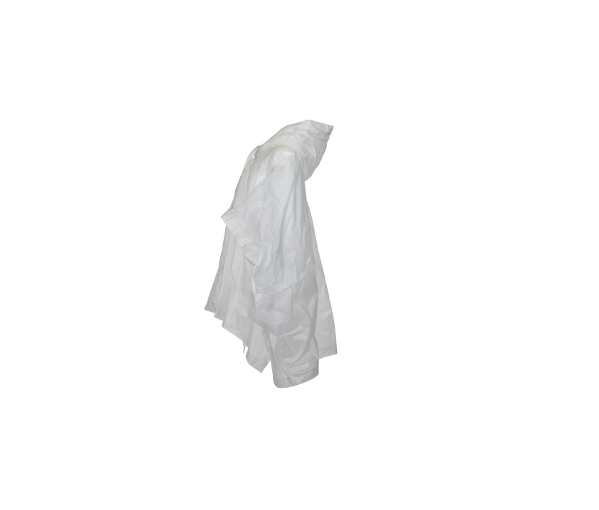 Cape de pluie en PVC. Imperméable et coupe-vent. Fermeture col par 2 boutons pression. Capuche avec cordon. Peut s’étendre à plat pour faire une bâche ou une protection sur le sol. Vendu avec une pochette avec poignée. 2 boutons pression de chaque côté.