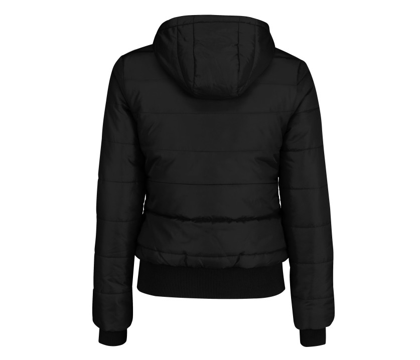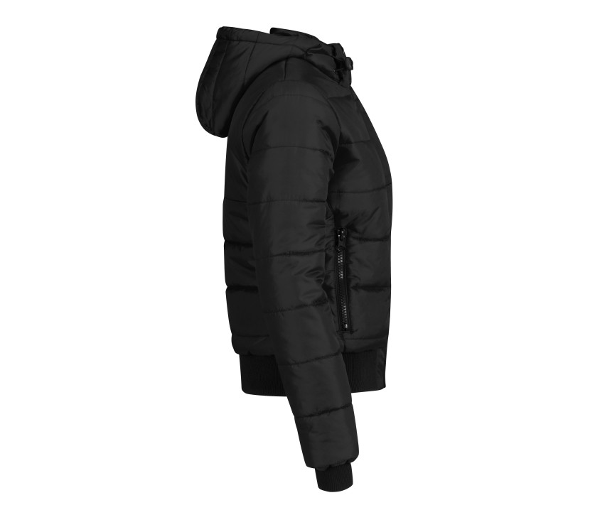 Tissu extérieur avec enduit acrylique, résistant aux averses, respirant et coupe-vent. Col montant. Patte intérieure anti-intempéries. Finition en côte sur les poignets et le bord inférieur. Accès marquage dos et cœur. 2 poches avant avec fermeture Éclair®. 1 poche portefeuille intérieure. Capuche rembourrée, détachable et ajustable.