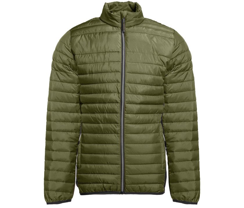 Doudoune légère moderne bi-matière, coupe ajustée. 2 poches latérales zippées. 2 poches intérieures. Protège menton. Zips contrastés. Dimension zone de marquage avant 9cm et 12cm à l’arrière.