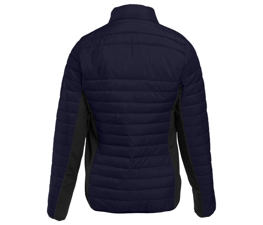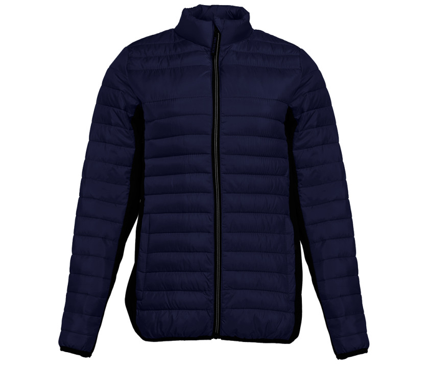 Doudoune légère moderne bi-matière, coupe ajustée. 2 poches latérales zippées. 2 poches intérieures. Protège menton. Zips contrastés. Dimension zone de marquage avant 9cm et 12cm à l’arrière.
