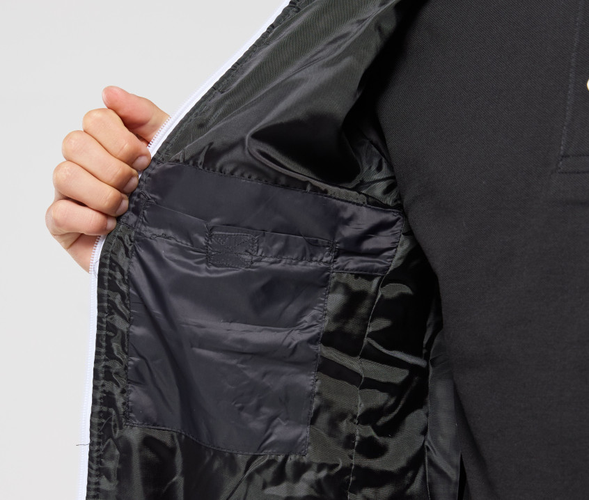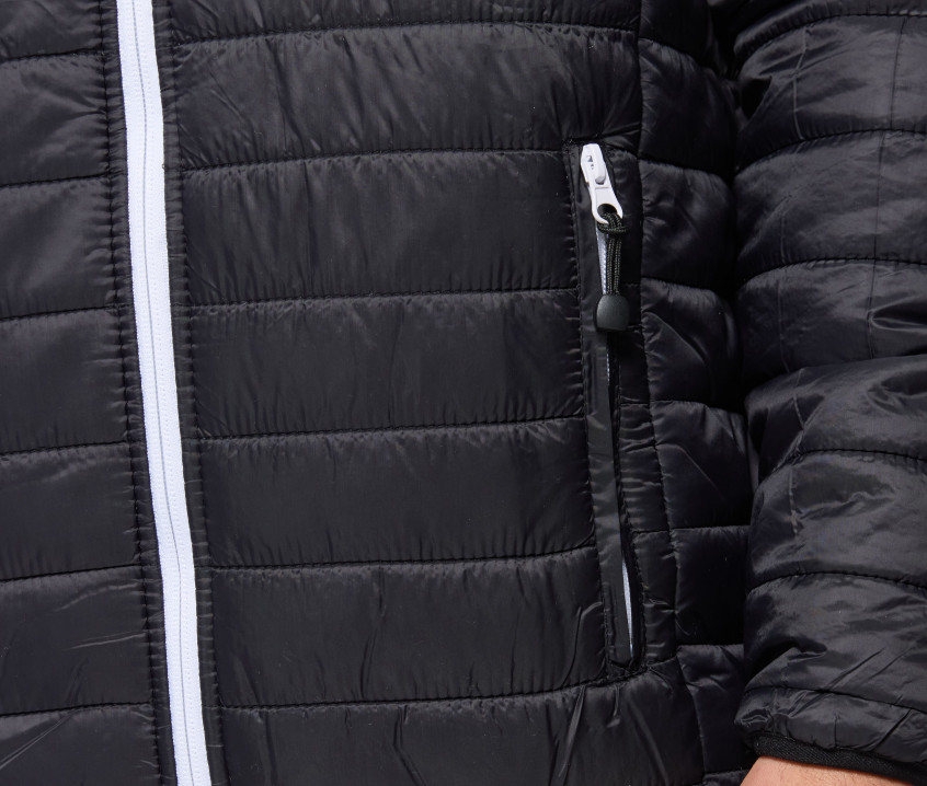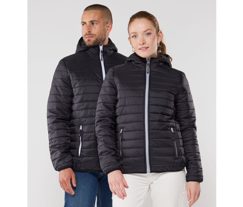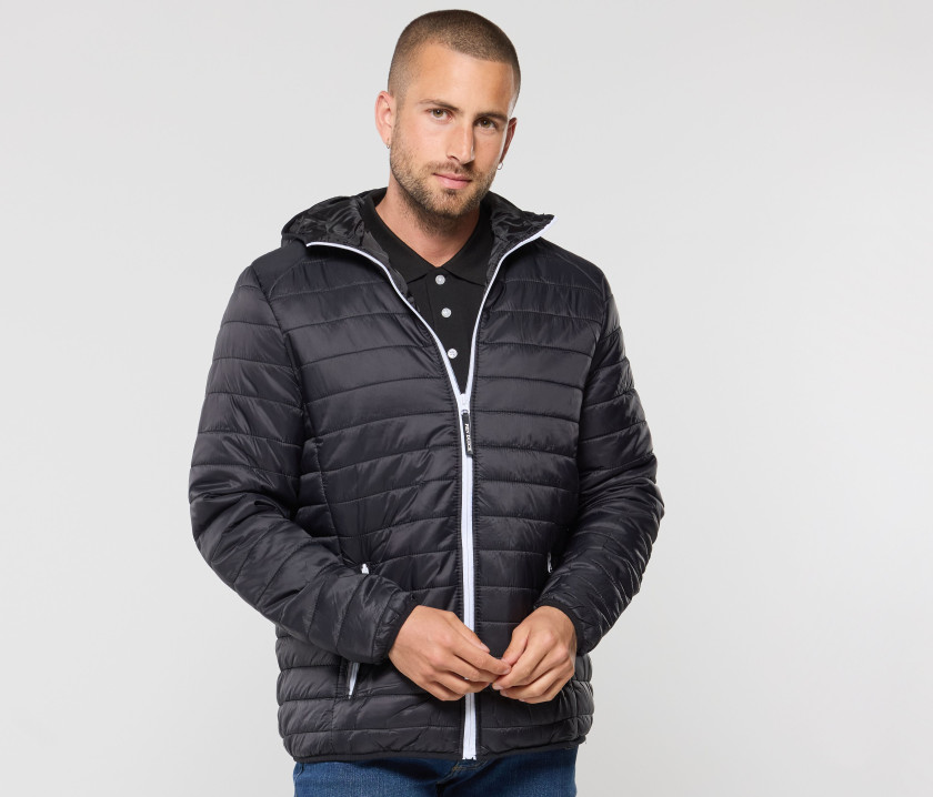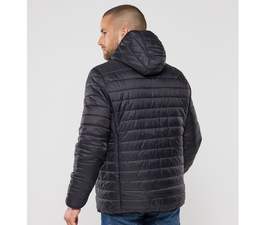 Doudoune avec capuche. Coupe-vent et déperlant. 2 poches latérales avec languette. Grande poche intérieure zippée. Poche intérieure Velcro®. Poignets et ourlet élastiqués. Hauteur entre les coutures : 4cm.