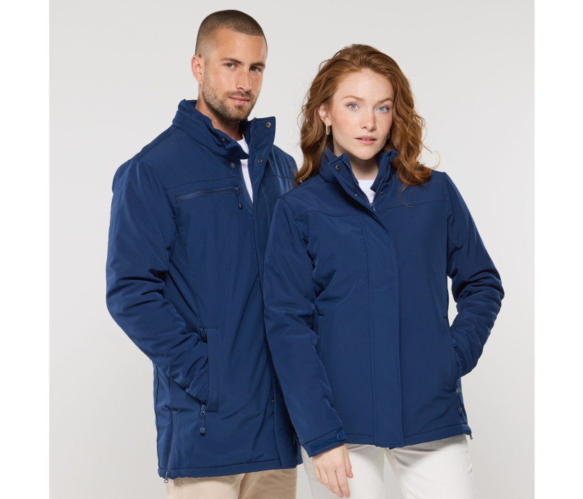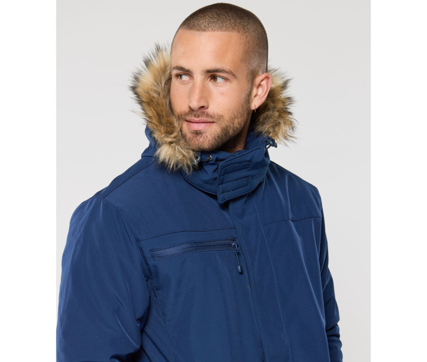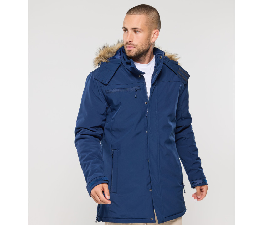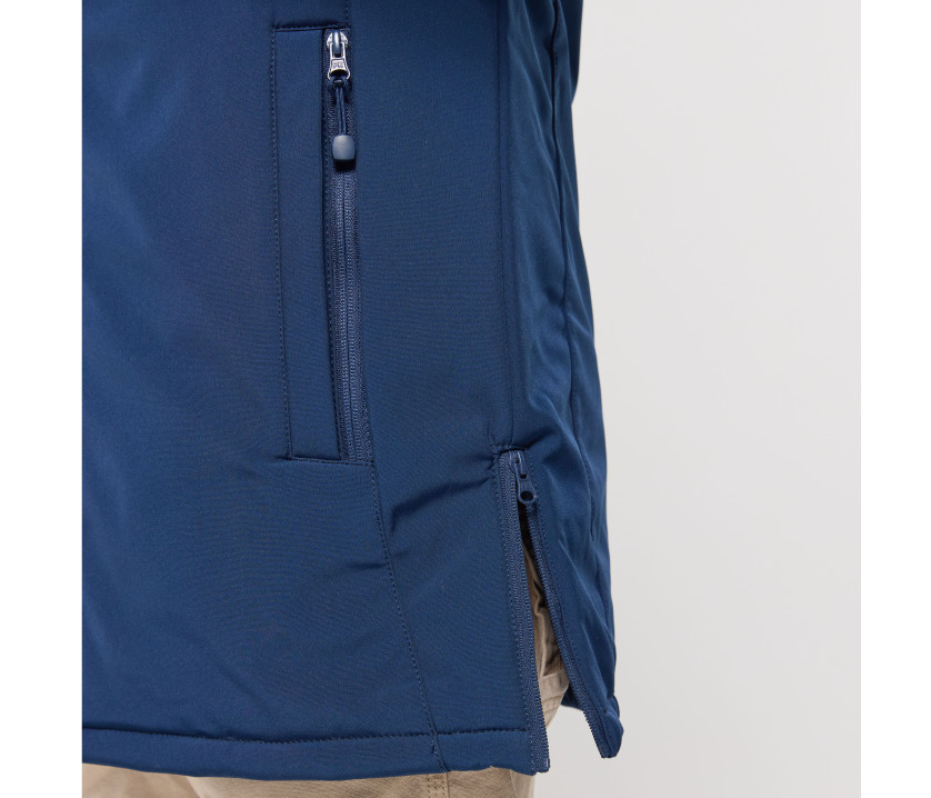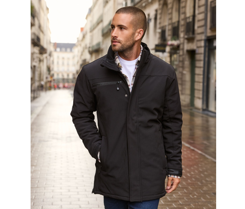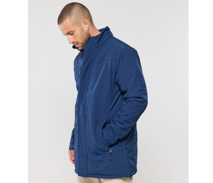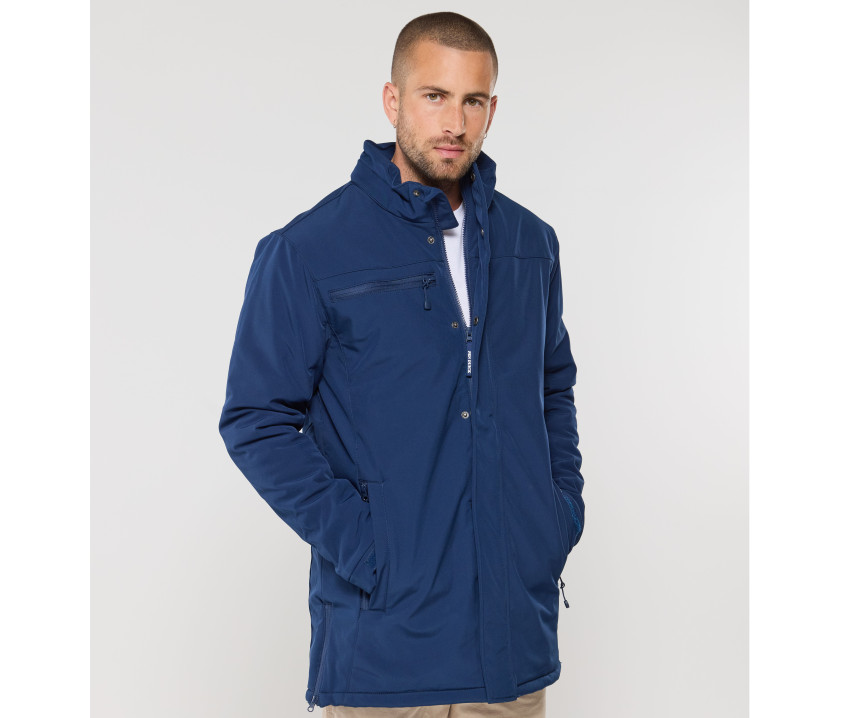 Parka Softshell homme 3 couches matelassée. Poche poitrine zippée. 2 poches zippées sur les côtés. 2 poches ouvertes sur les côtés. Possibilité d'ajouter les capuches Réf. PK995, Réf. PK996 et Réf. PK997 page 209 (zip caché dans le col). Accès marquage dans le dos. Poche tablette intérieure. Poignets ajustables par languettes Velcro®.