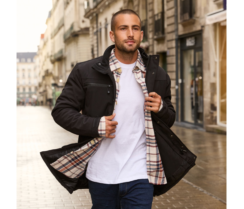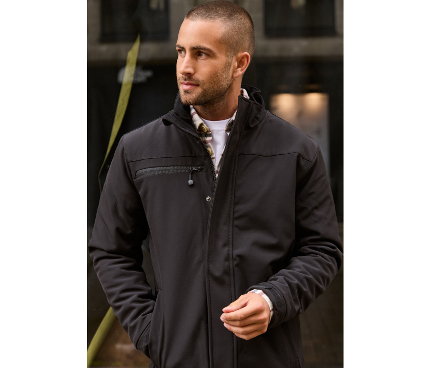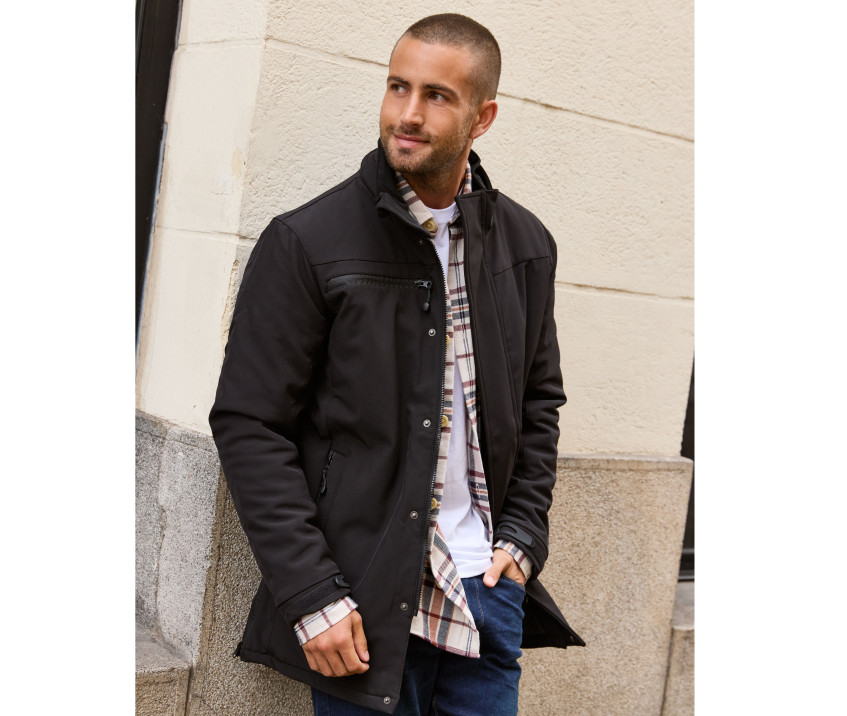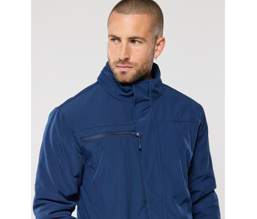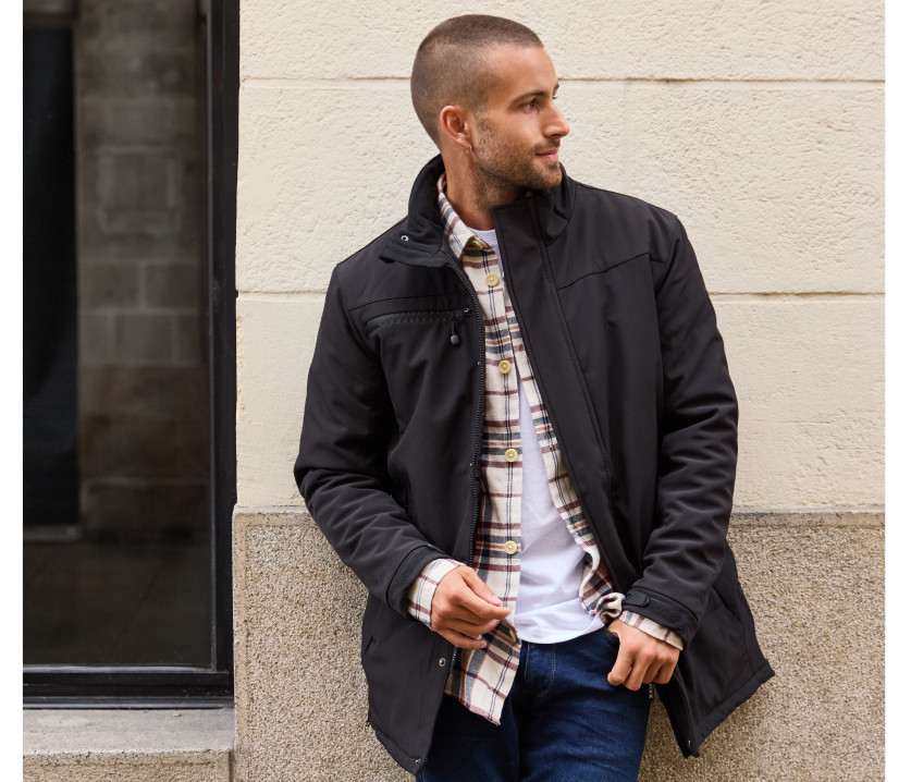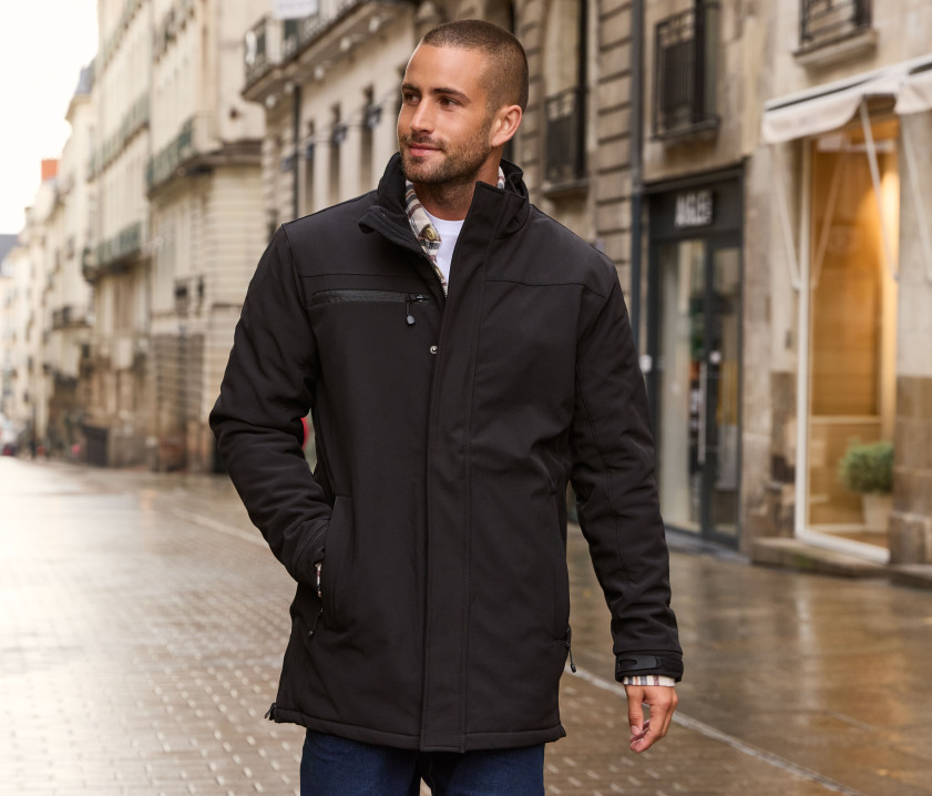 Parka Softshell homme 3 couches matelassée. Poche poitrine zippée. 2 poches zippées sur les côtés. 2 poches ouvertes sur les côtés. Possibilité d'ajouter les capuches Réf. PK995, Réf. PK996 et Réf. PK997 page 209 (zip caché dans le col). Accès marquage dans le dos. Poche tablette intérieure. Poignets ajustables par languettes Velcro®.