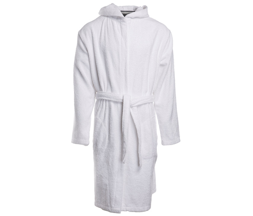 Peignoir de bain avec capuche. Bande de propreté en velours. 2 poches. Ceinture.