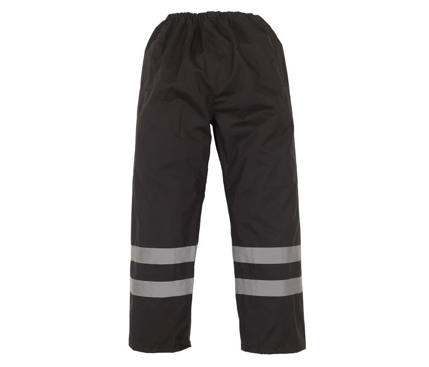 Conforme à la spécification EN ISO20471:2013 Class 1 & EN343 contre le mauvais temps. Coloris Hi-vis orange/navy également conforme à la spécification GO/RT3279. 2 bandes horizontales de 5cm cousues au niveau des mollets. Taille élastiquée. Chevilles ajustables par bouton pression. Coutures thermocollée. Imperméable.