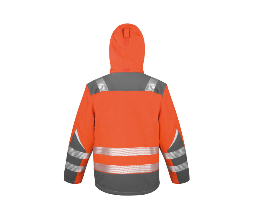 Softshell 3 couches avec capuche. Cordon de serrage capuche et Velcro® ajustable de profondeur. 3 poches extérieures (2 poches côtés et 1 poche poitrine). 2 poches intérieures. Rabats de protection intérieur et extérieur. Bandes réfléchissantes corps et bras. Protection poignet. Approuvé certification EN ISO20471. Imperméable : 8000mm. Respirable : 1000 g/m².