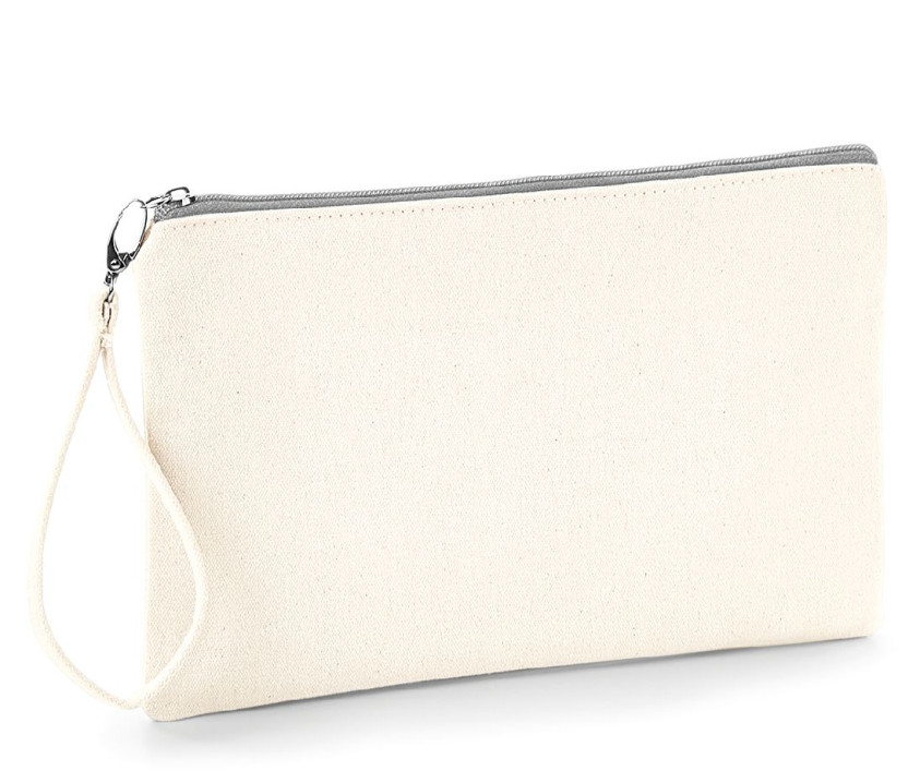 Pochette multi-usages. Coton lourd premium. Zip contrasté. Dragonne détachable, longueur : 15cm. Surface d'impression : 21x13cm.