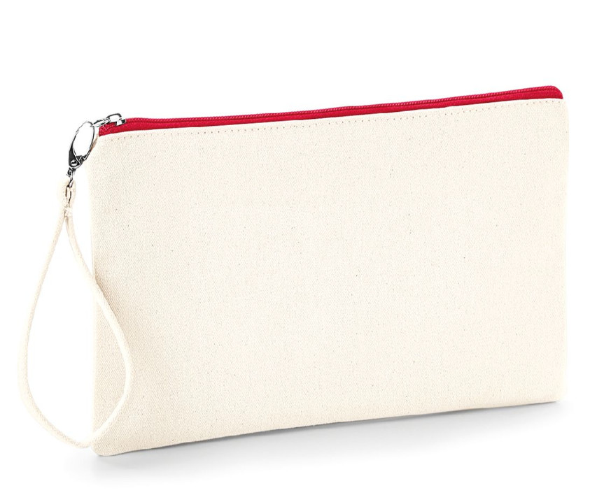 Pochette multi-usages. Coton lourd premium. Zip contrasté. Dragonne détachable, longueur : 15cm. Surface d'impression : 21x13cm.