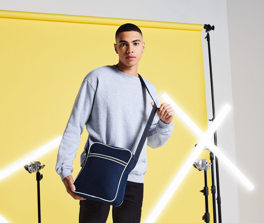 Style rétro. Poche intérieure zippée. Poche avant zippée. Surface d’impression : 22x18cm. Bandoulière ajustable.