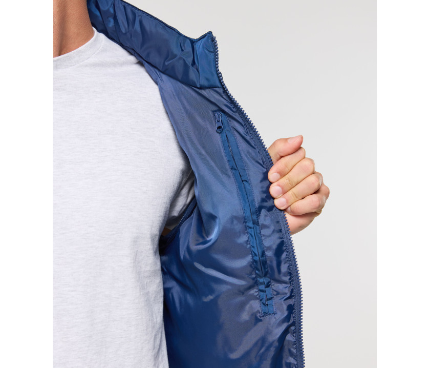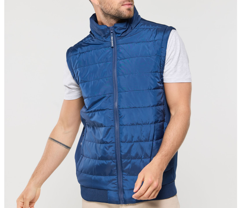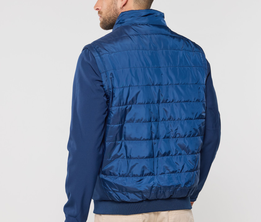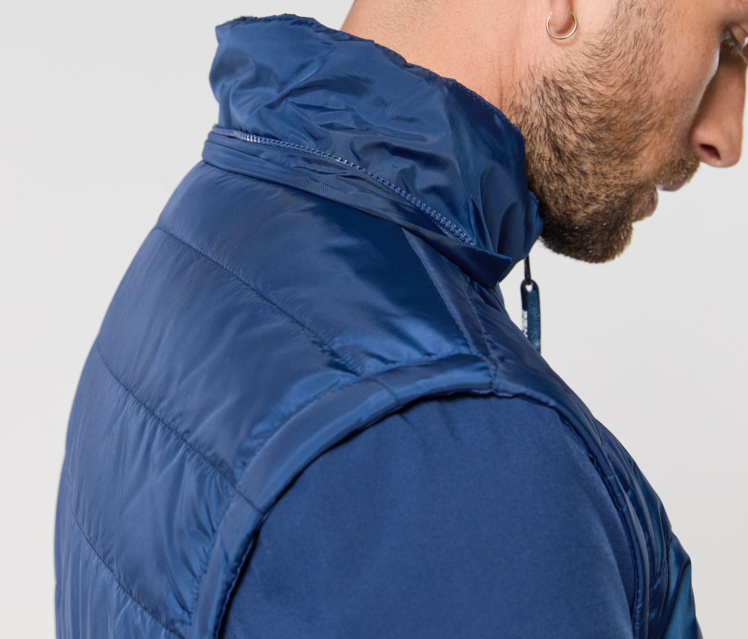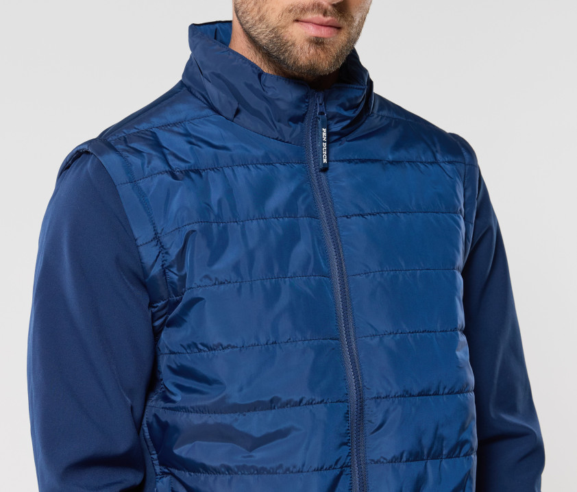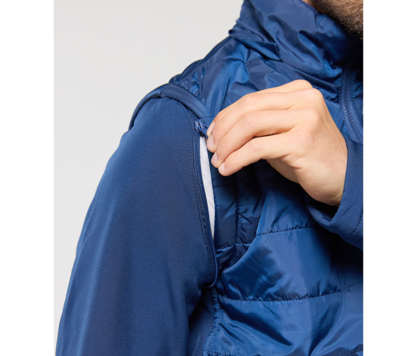 Veste matelassée aux manches amovibles. Combinaison de 2 matières : corps matelassé, manches et côtés en Soft-Shell. Possibilité d'ajouter les capuches Réf. PK995 - PK996 - PK997 page 196 (zip caché dans le col). Bord côte épais à la taille. Zip invisible dans le dos pour marquage. Poche intérieure côté droit.