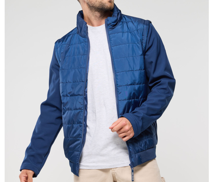 - Veste matelassée aux manches amovibles. Combinaison de 2 matières : corps matelassé, manches et côtés en Softshell. Possibilité d'ajouter les capuches Réf. PK995, Réf. PK996, Réf. PK997.