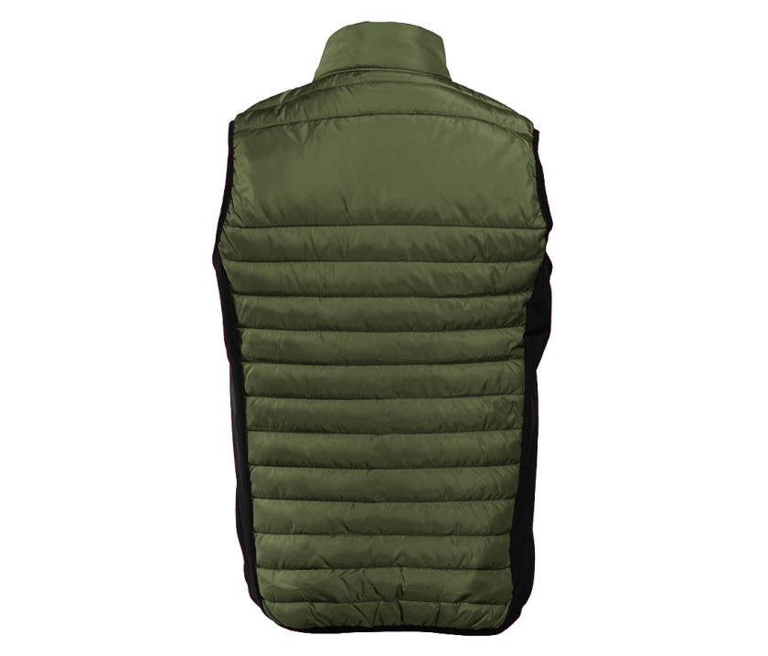 Bodywarmer léger moderne bi-matière. 2 poches latérales zippées. Protège-menton. Zips contrastés. Dimension zone de marquage avant 9cm et 12cm à l’arrière.